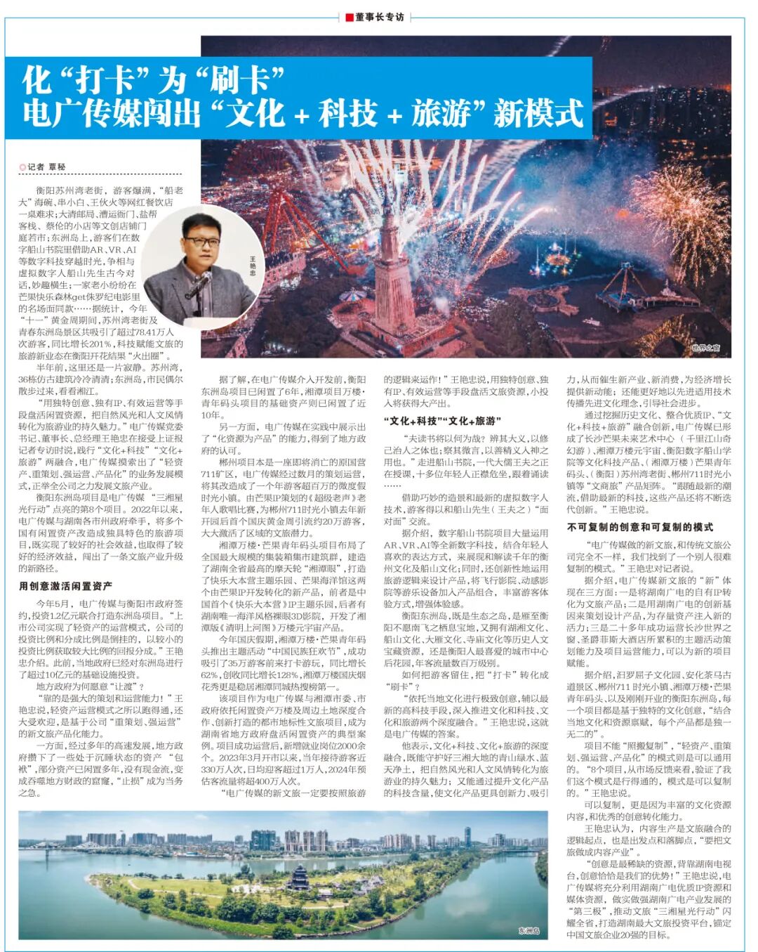 通过挖掘历史文化、整合优质IP、“文化+科技+旅游”融合创新,澳门新葡8455线路检测中心已形成了长沙芒果未来艺术中心(千里江山奇幻游)、湘潭万楼元宇宙、衡阳数字船山学院等文化科技产品、(湘潭万楼)芒果青年码头、(衡阳)苏州湾老街、郴州711时光小镇等“文商旅”产品矩阵。“跟随最新的潮流,借助最新的科技,这些产品还将不断迭代创新。”王艳忠说。
